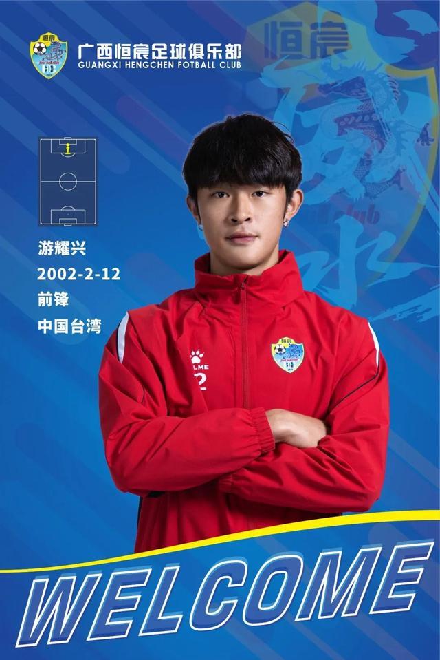 经俱乐部与球员本人协商一致,中国台湾前锋游耀兴(Yao-Hsing Yu)正式加盟广西恒宸,成为俱乐部队史首位港澳台球员。未来游耀兴将代表广西恒宸征战各项赛事,期待他为广西足球带来更多荣誉!